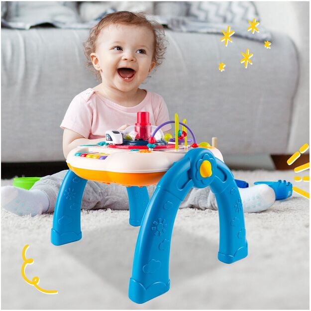 Žaidimo skydelis (viršutinė dalis): galima nuimti nuo kojų ir naudoti atskirai – puikiai tinka žaisti ant grindų, lovos ar stalo. Sudėtyje yra interaktyvių elementų: fortepijono, traukinio, garsų, šviesų ir judančių elementų, lavinančių vaiko pojūčius.